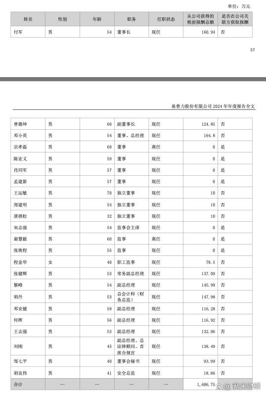 2024年年报显示,公司董事、监事和高级管理人员2024年报酬总额1,606.75万元。董事长付军2024年从公司获得的税前报酬总额为160.94万元。董事、总经理邓小英2024年从公司获得的税前报酬总额为164.8万元,董事会秘书邹七平2024年从公司获得的税前报酬总额为93.99万元,以上人员均未在公司关联方获取报酬。